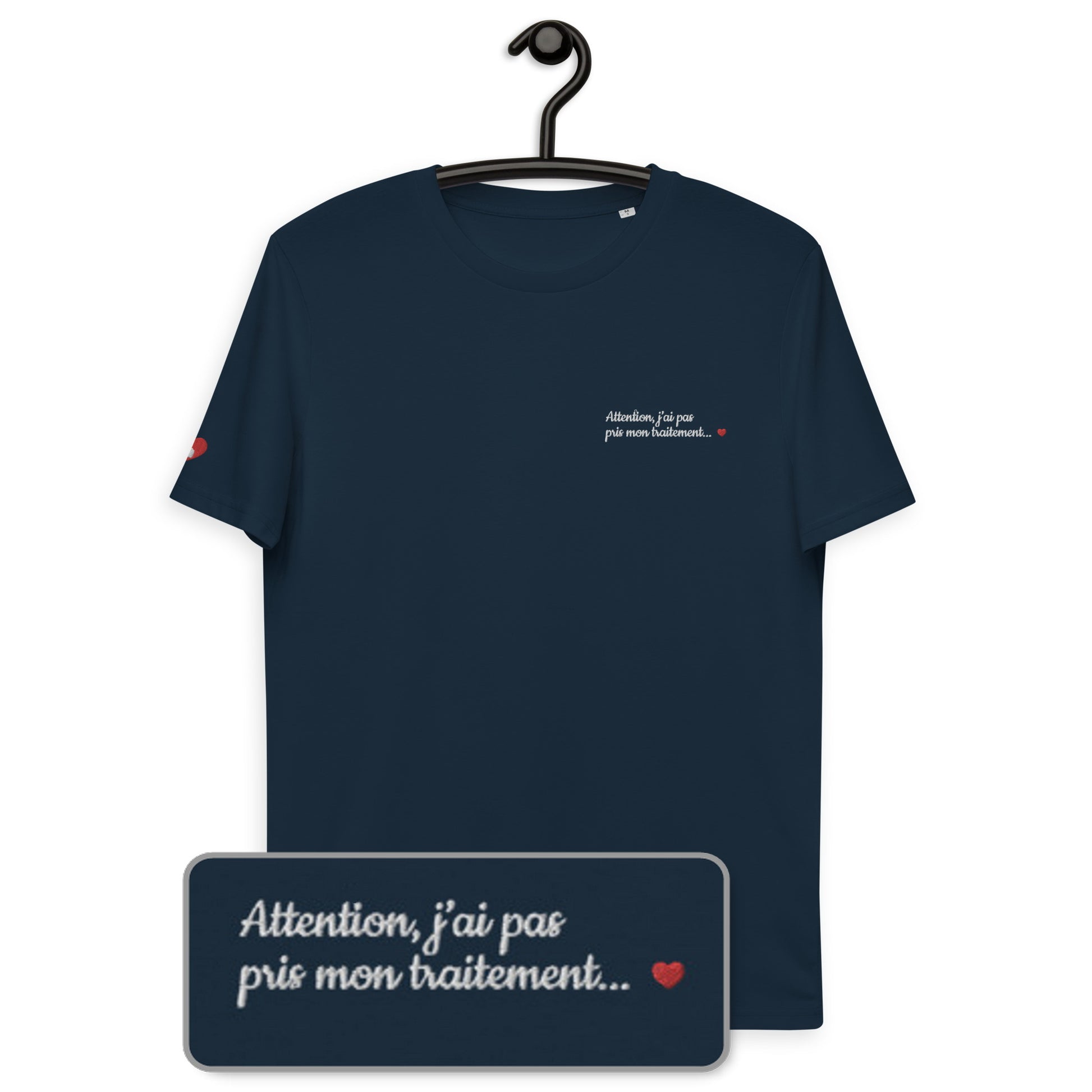 T-shirt bio unisexe : Attention j'ai pas pris mon traitement / Noir ou Bleu