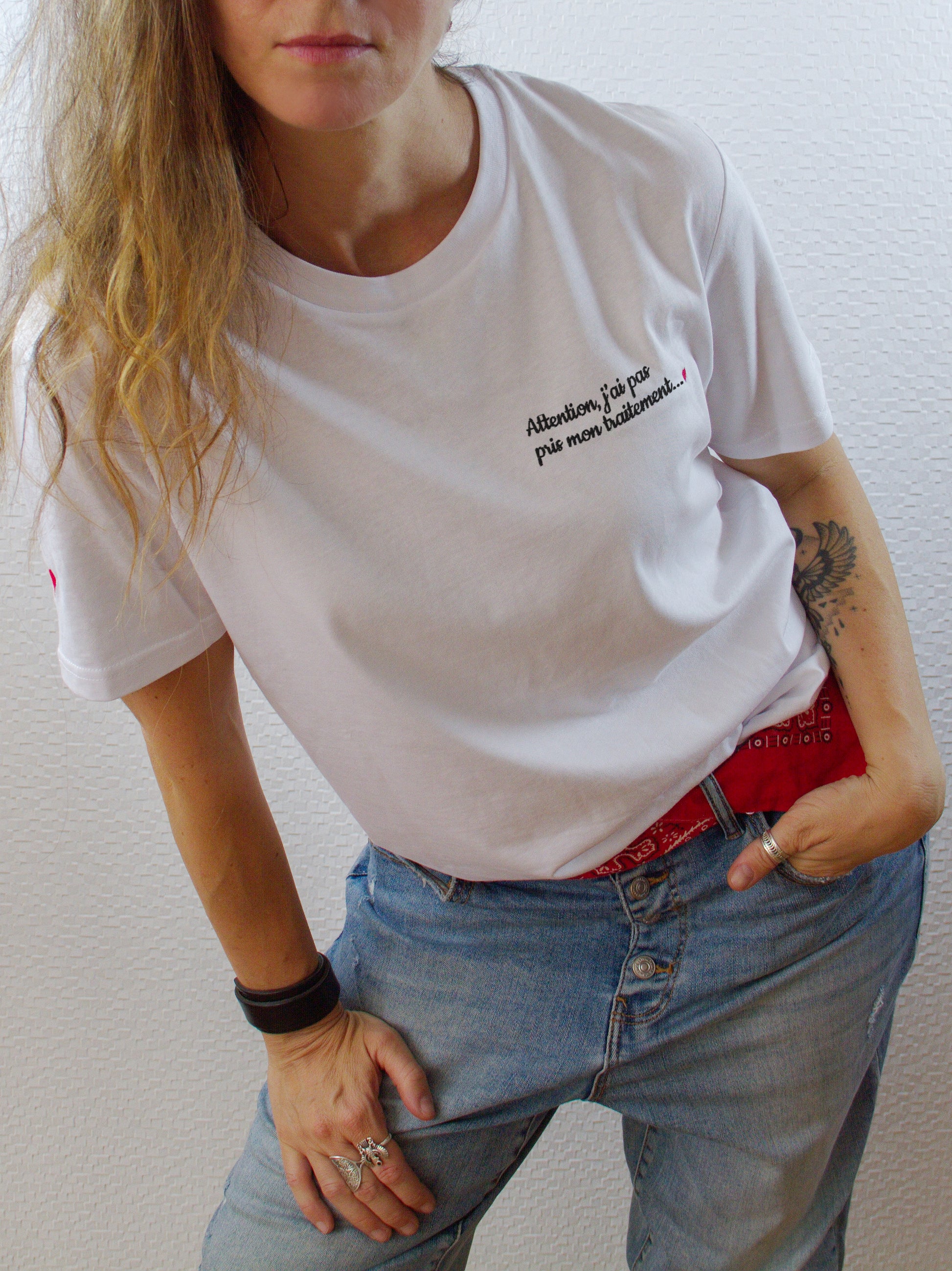 Incontournable et iconique du vestiaire, il se décline en blanc, gris chiné, noir et marine (non, pas elle, la couleur). En contraste bicolore, la broderie vient asséner avec élégance et raffinement un message de (sale) caractère dont Sarcasmes a le secret. Bref, c’est beau mais irrévérencieux, chic mais anticonformiste, c’est français quoi !